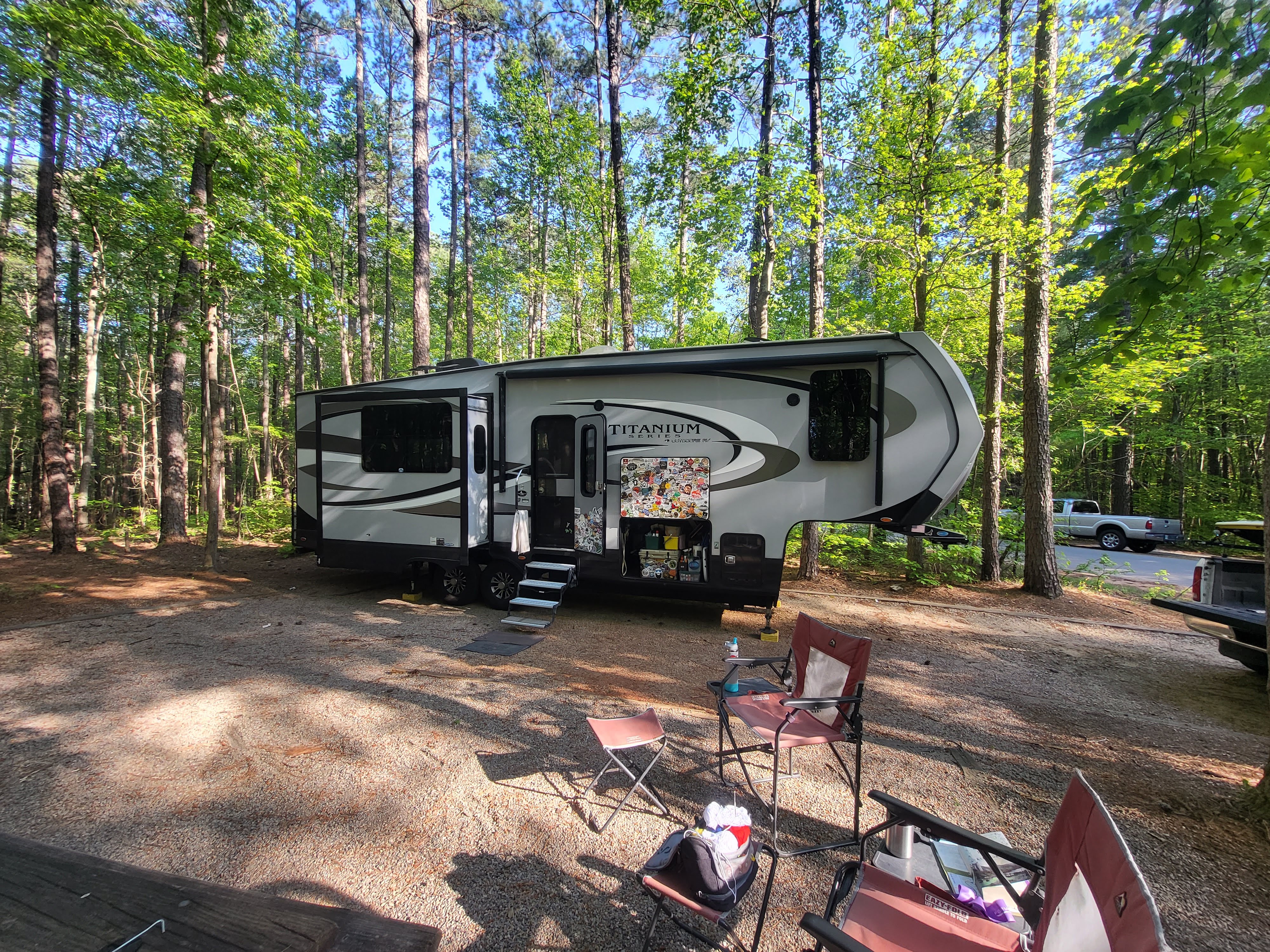 North Carolina for a 10 day stay. We stayed 15 minutes from Charley & Steves place and had fun with them traveling to many a brewery and had lots of fun with Ana. She is just shy of 2 and it took her a while to warm up to us but that is to be expected. Such a cutie and fun to watch. Her nanny's son called us Grandma and Grandpa, so I guess we have a new Grandson. His name is Holden! The area had a ton of rain and the lake was real floody but still pretty. We hiked around the park a bit and had a great time visiting with more family. Wen on adventures to breweries, dinosaur's, parks, eateries, saw lots of turtles, made yummy cinnamon rolls, watched the hawks in the yard & drank bourbon. Life was good in NC.